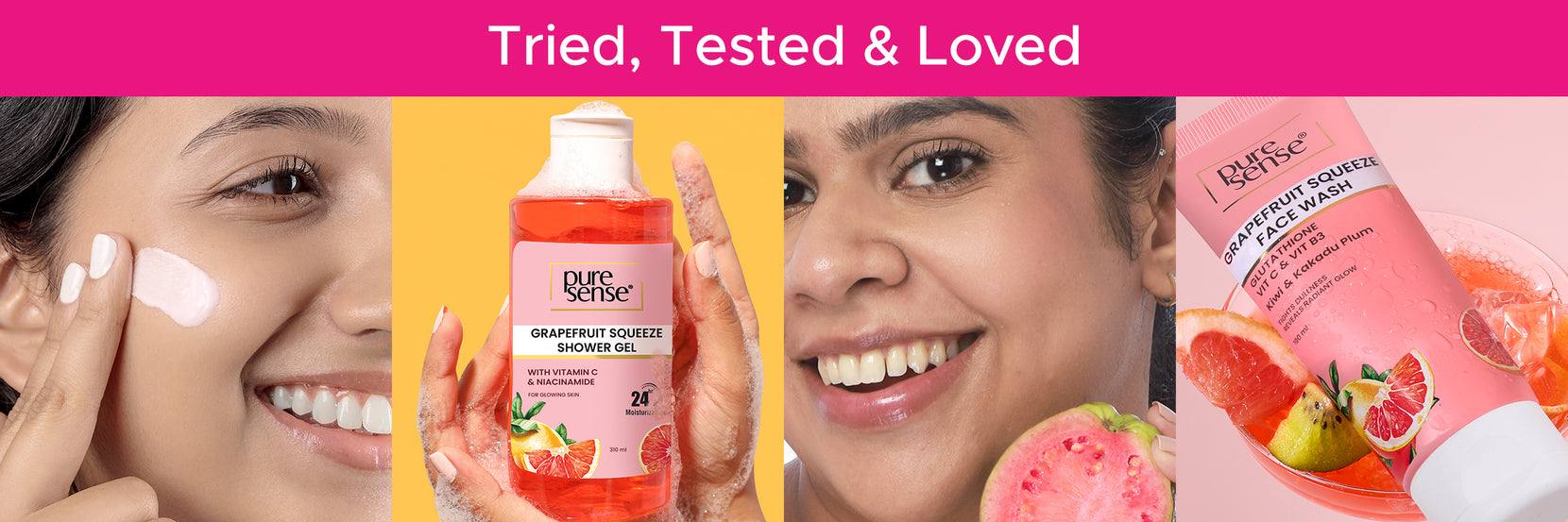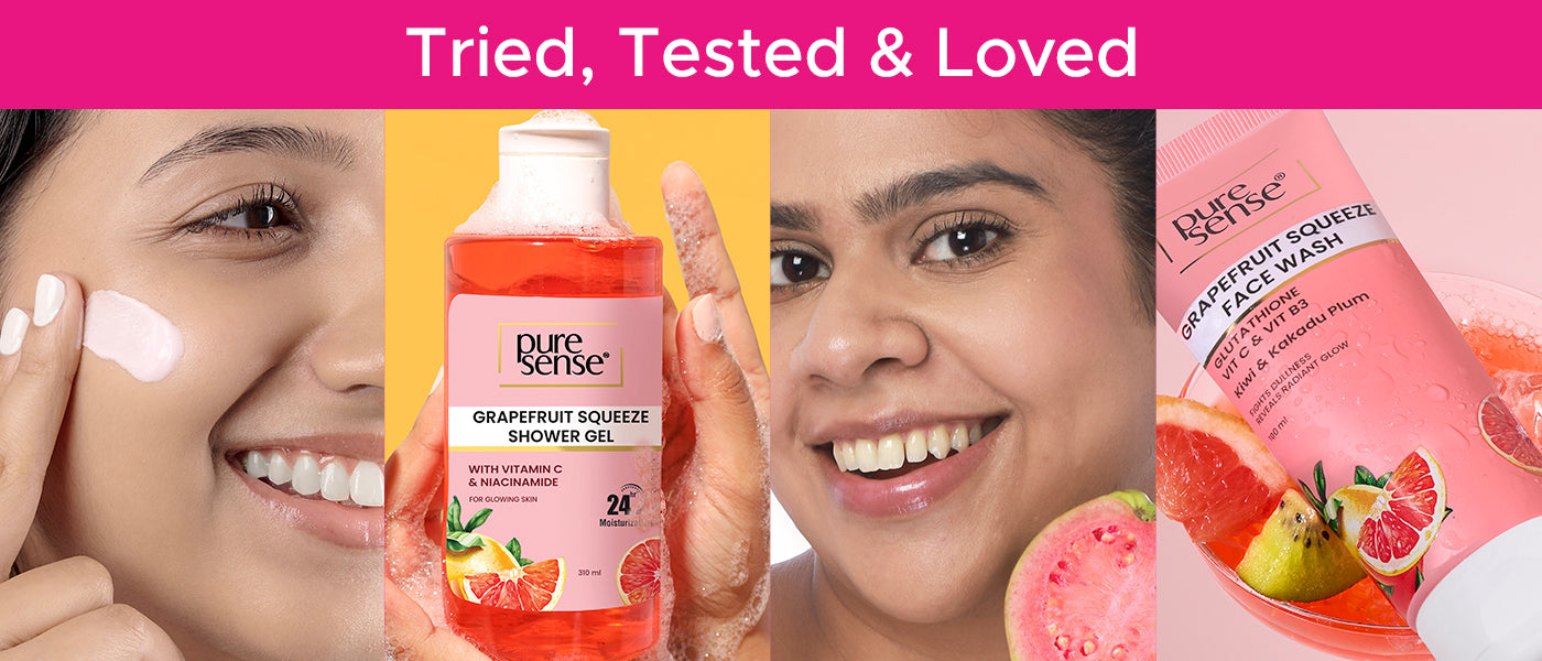 Refreshing PureSense Squeeze Grapefruit Shower Gel, enriched with Vitamin C and Niacinamide, designed to cleanse and nourish your skin.