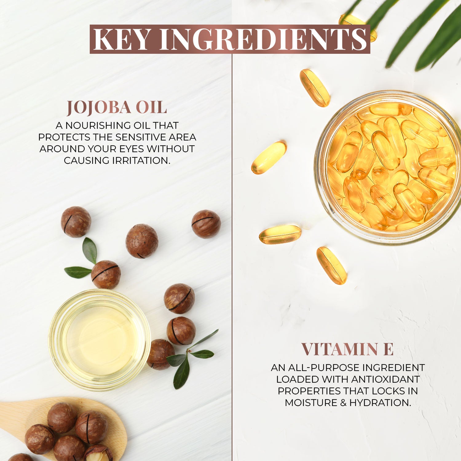 The formula contains nourishing ingredients like Jojoba Oil and Vitamin E that help support comfort. A patch test is recommended for sensitive eyes.